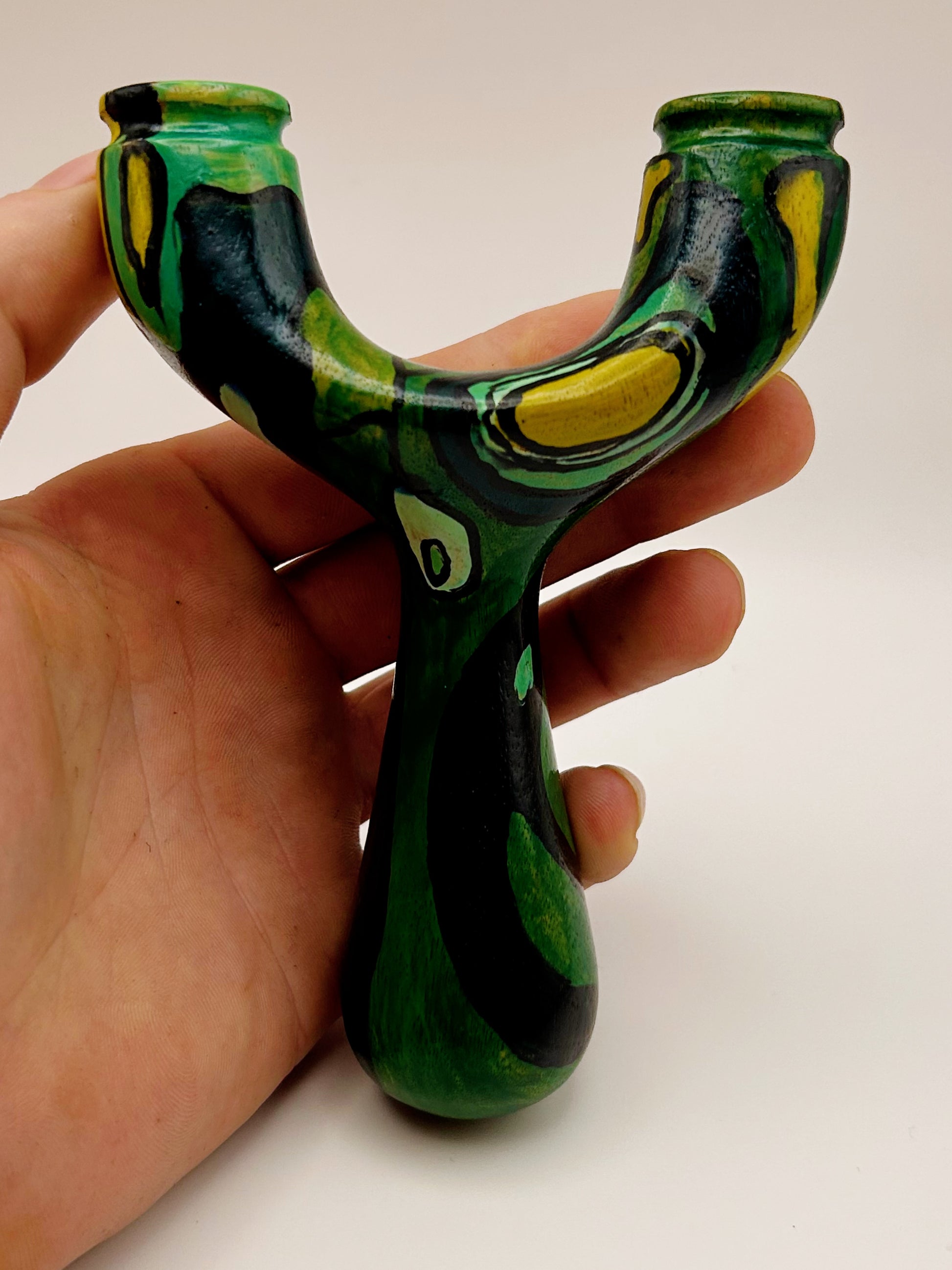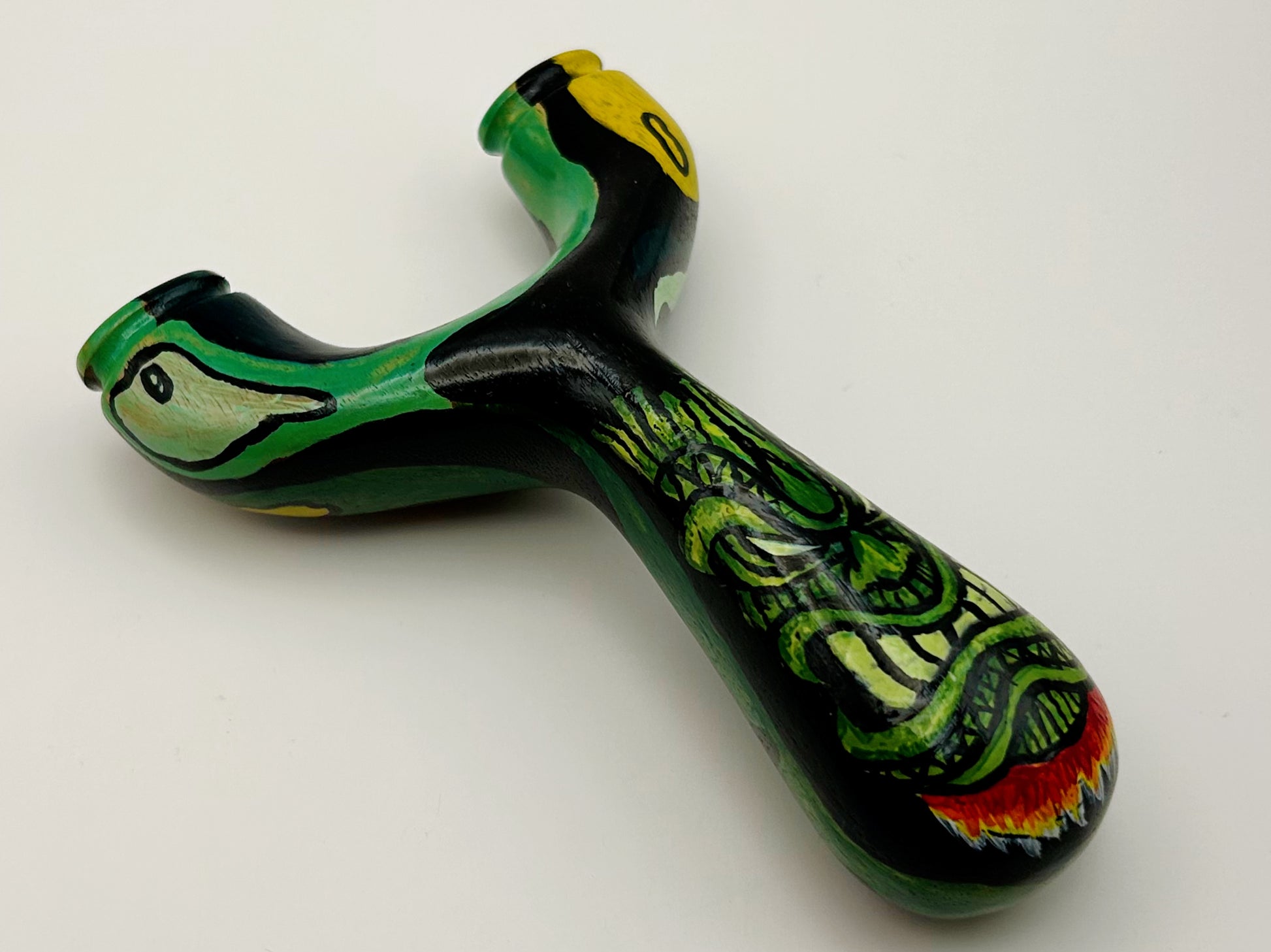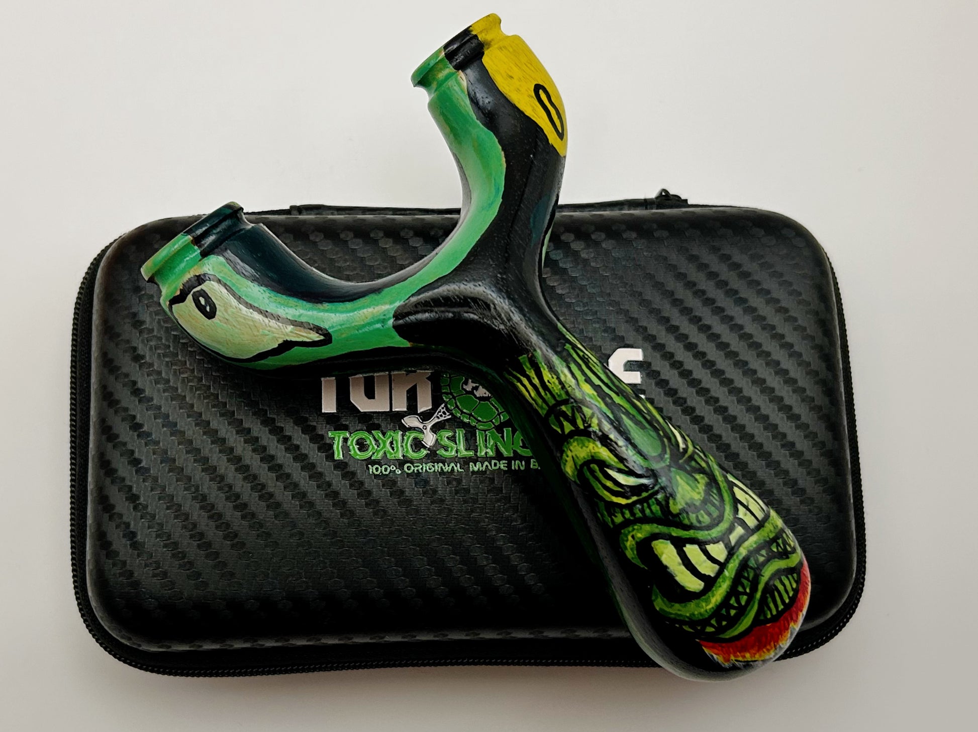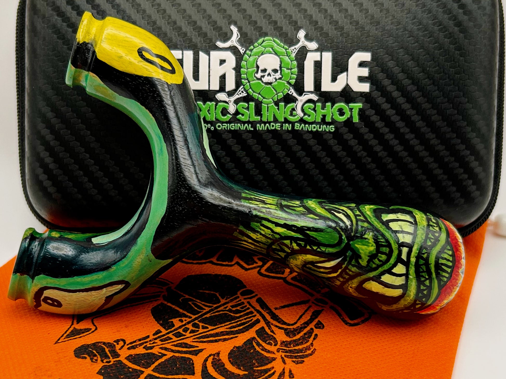 Tiki Natty Produced by Turtle Slingshots based in Indonesia. Made from exotic wood hand sourced in Indonesia this Natty features one of a kind artwork. Can be shot in either the left or right hand and is made to be held with a brace-grip style hold. The Ergonomic design allows for a comfortable and secure hold when using.