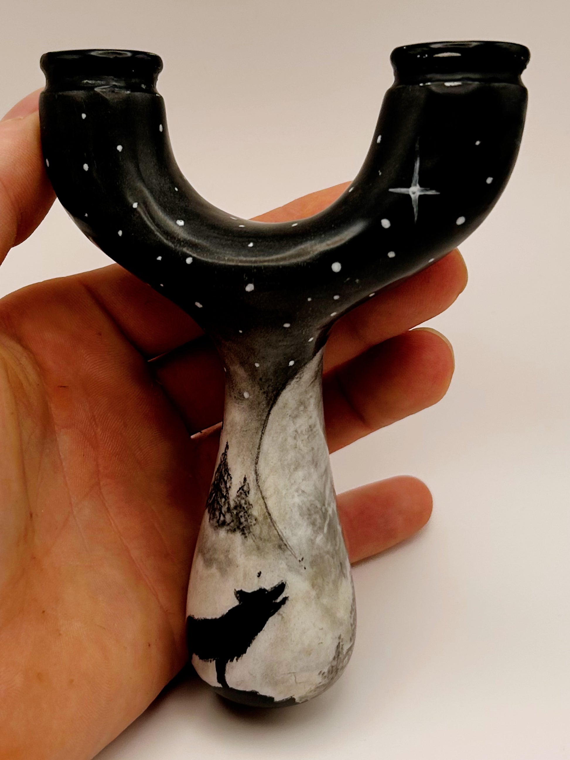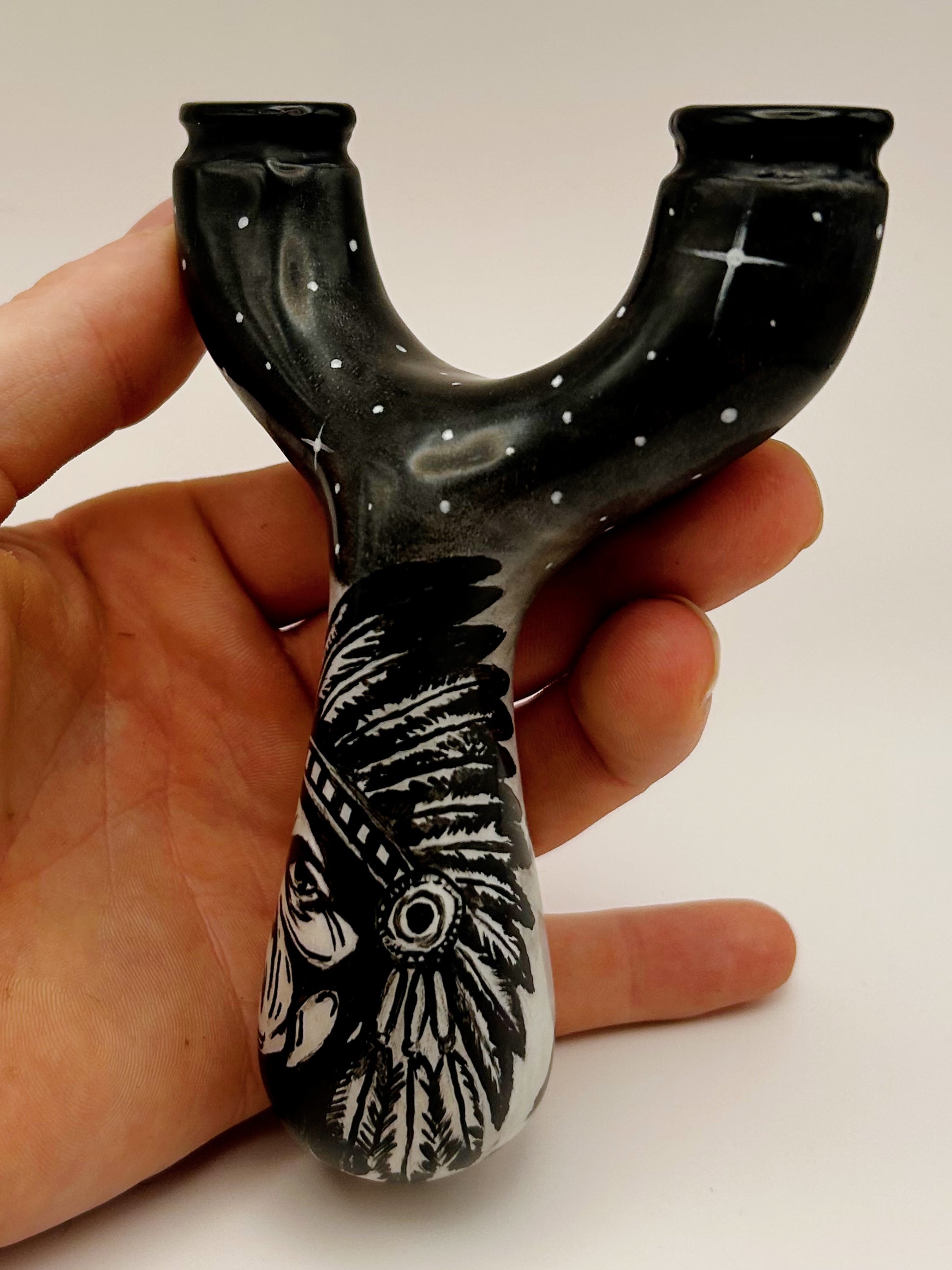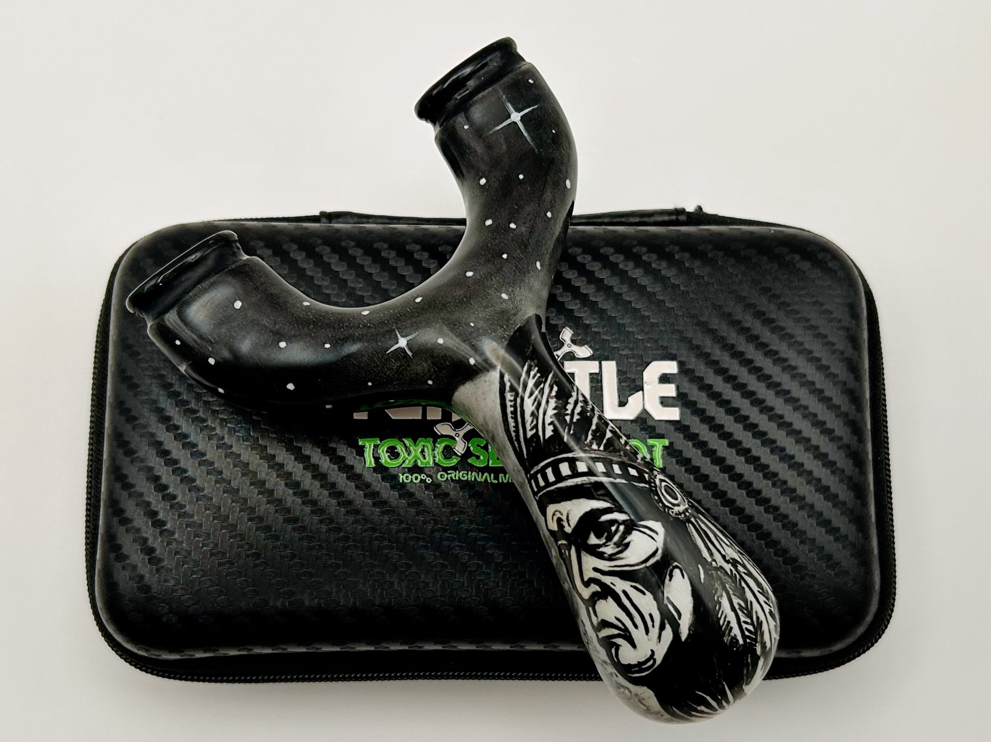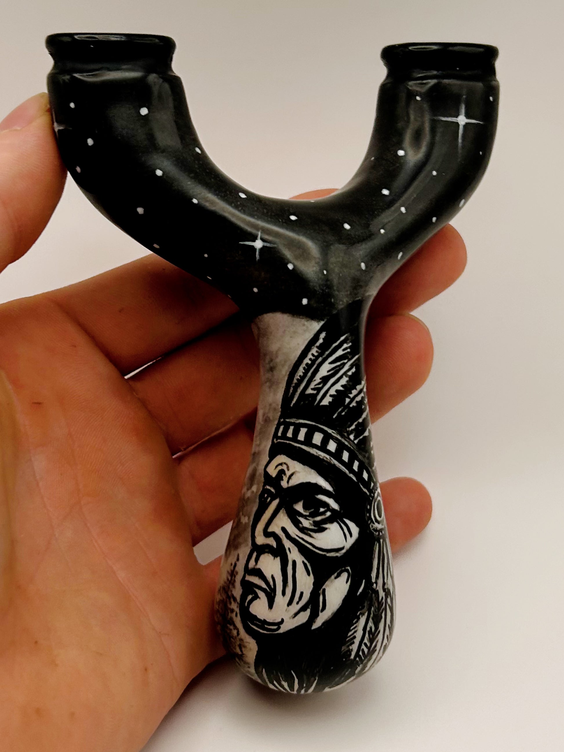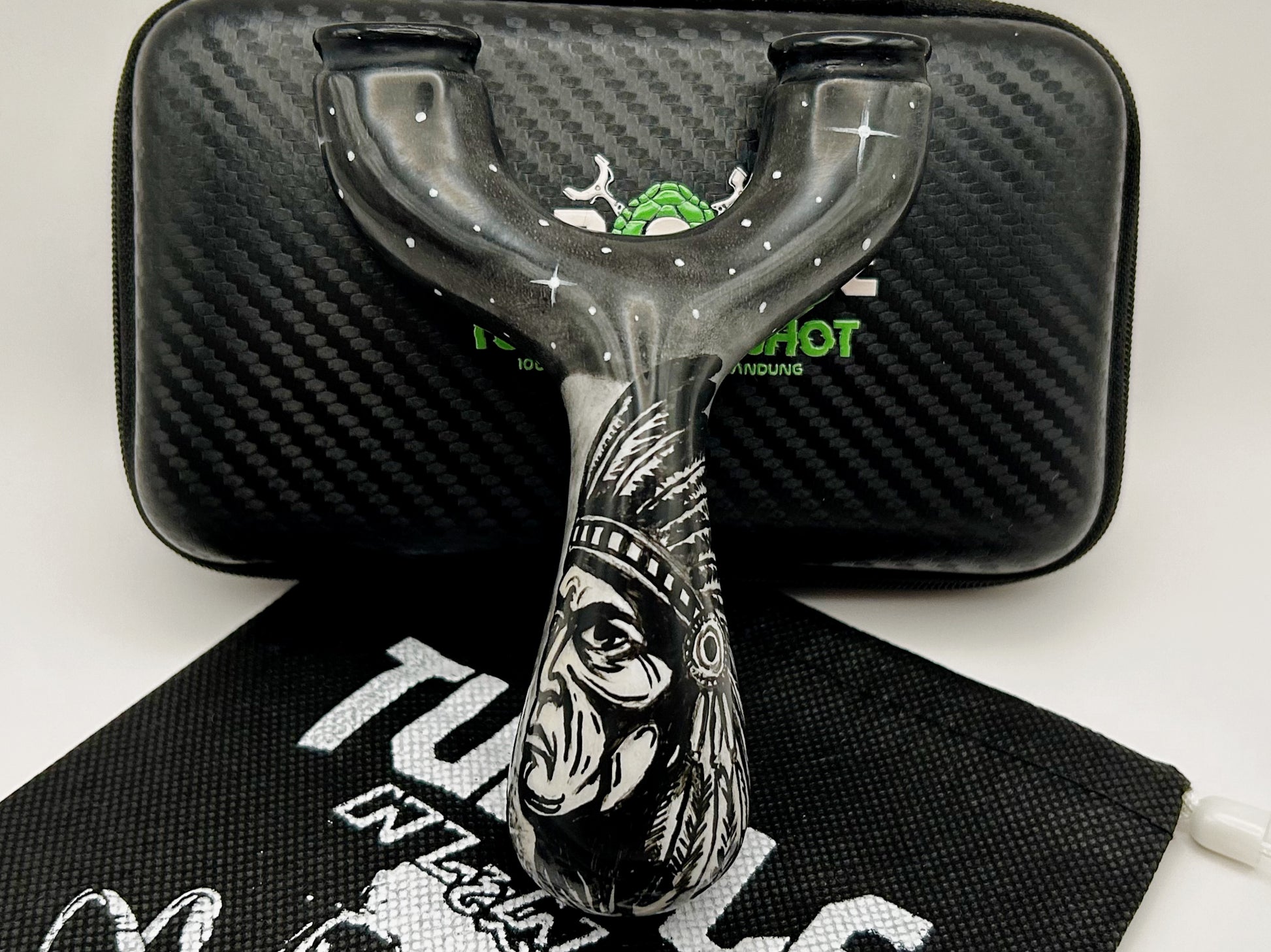 Native Chief Natty: Produced by Turtle Slingshots based in Indonesia. Made from exotic wood hand sourced in Indonesia this Natty features one of a kind artwork. Can be shot in either the left or right hand and is made to be held with a brace-grip style hold. The Ergonomic design allows for a comfortable and secure hold when using.