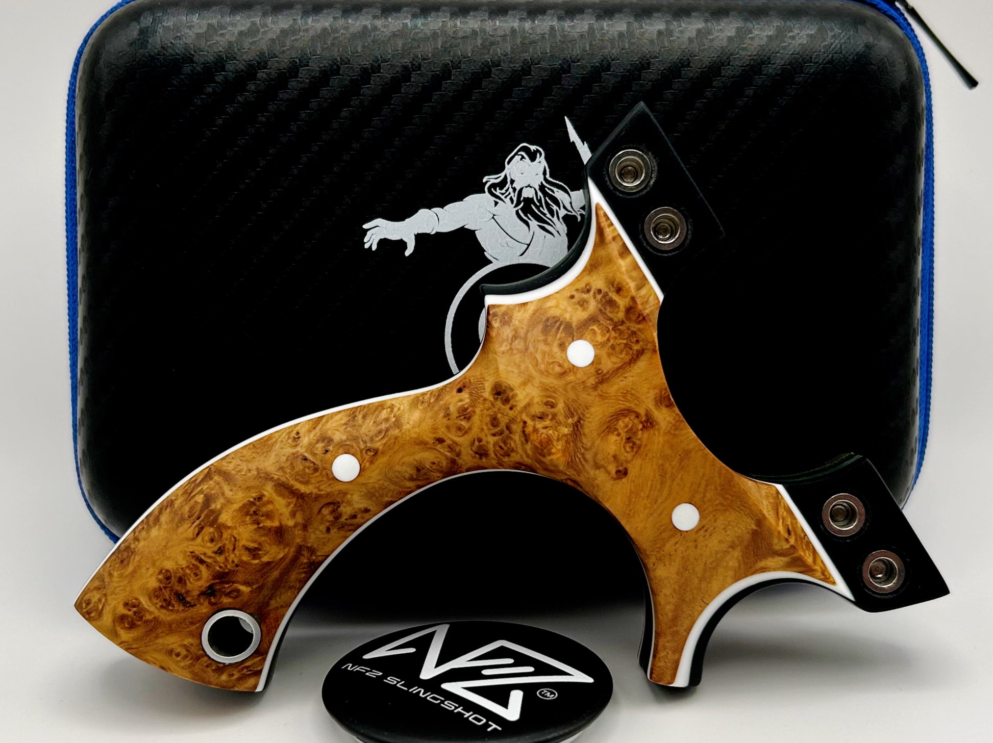 Eagle by NFZ (left hand hold): The eagle is a wonderful slingshot designed to be held with a pinch-grip style hold. Very comfortable and stable hold with crisp reference points. 100% handmade beauty, Highly recommended.