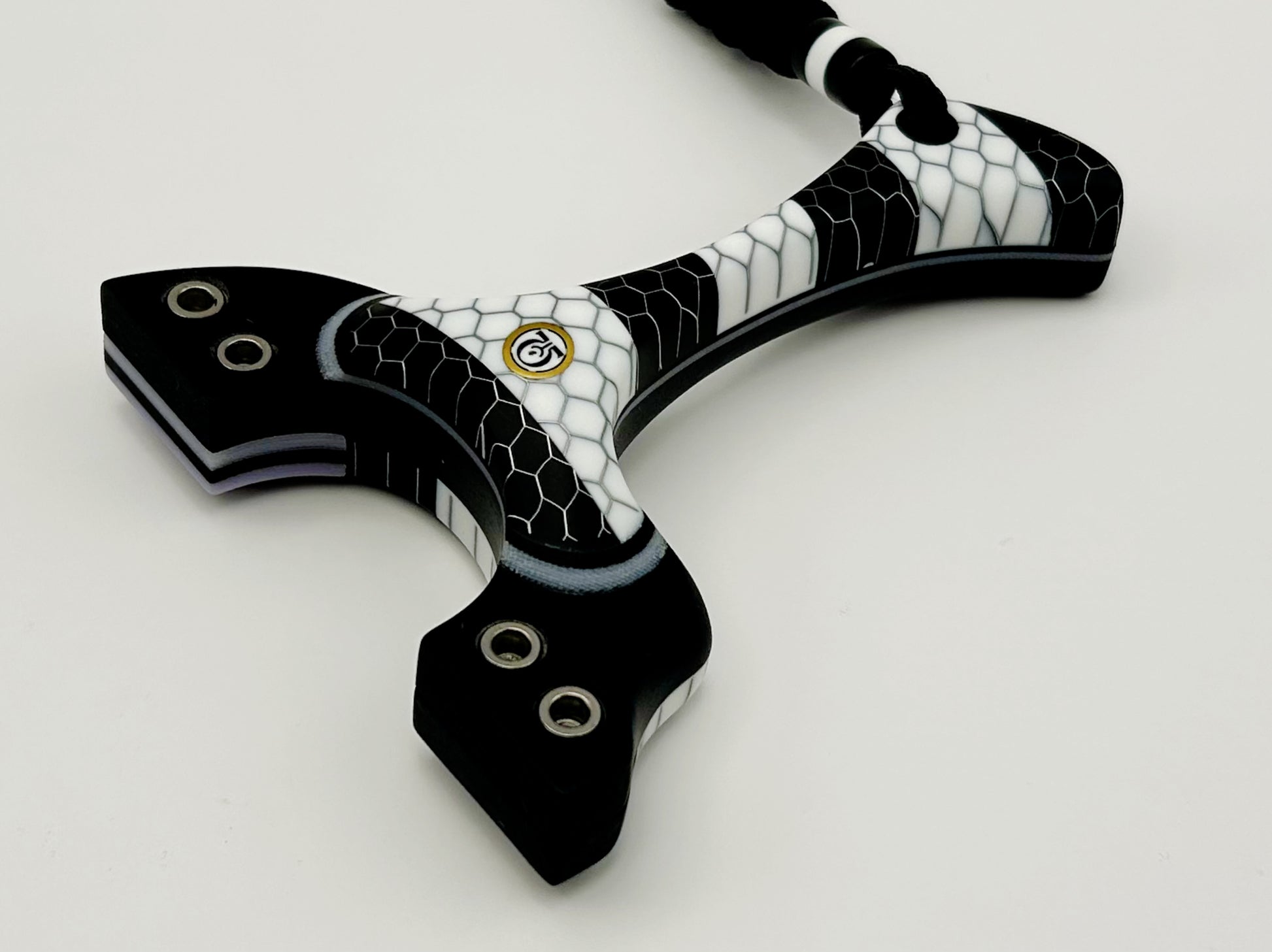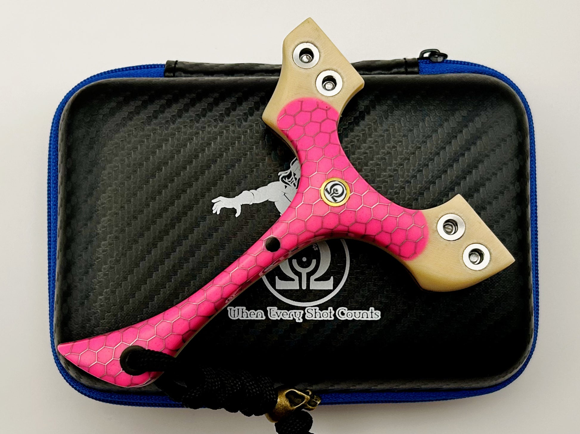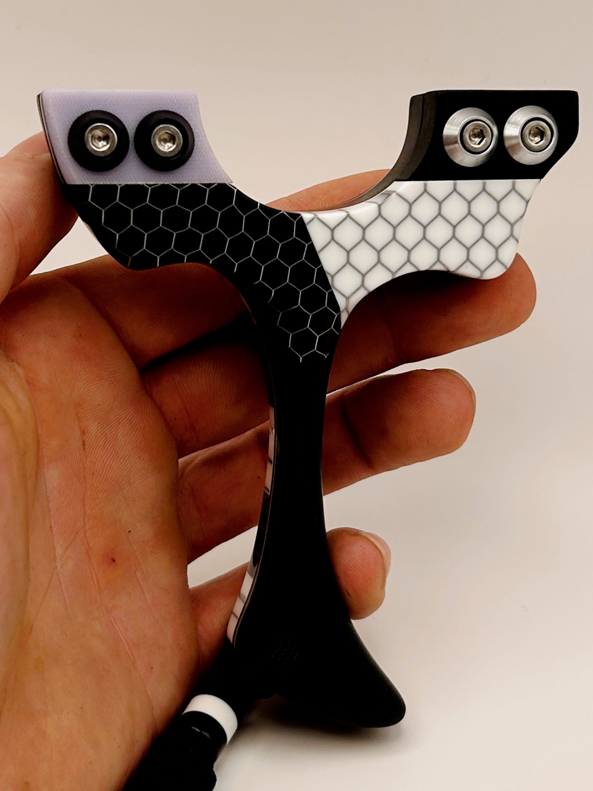 T-Bone (Left Hand Hold): Designed by Chuckin Steel and produced by Turtle Slingshots based in Indonesia. The T-Bone was designed to be held with a brace-grip style hold when using. Nice short forks with a comfortable ergonomic hold.