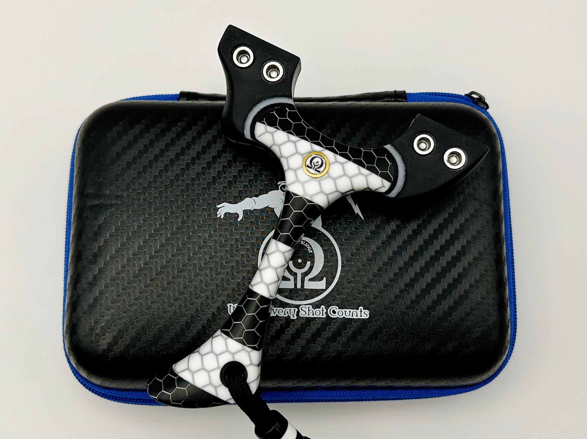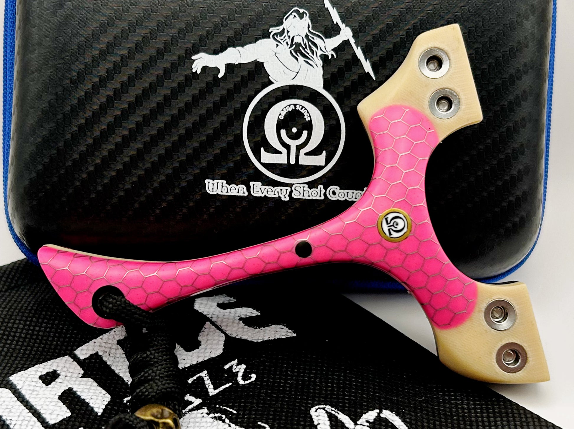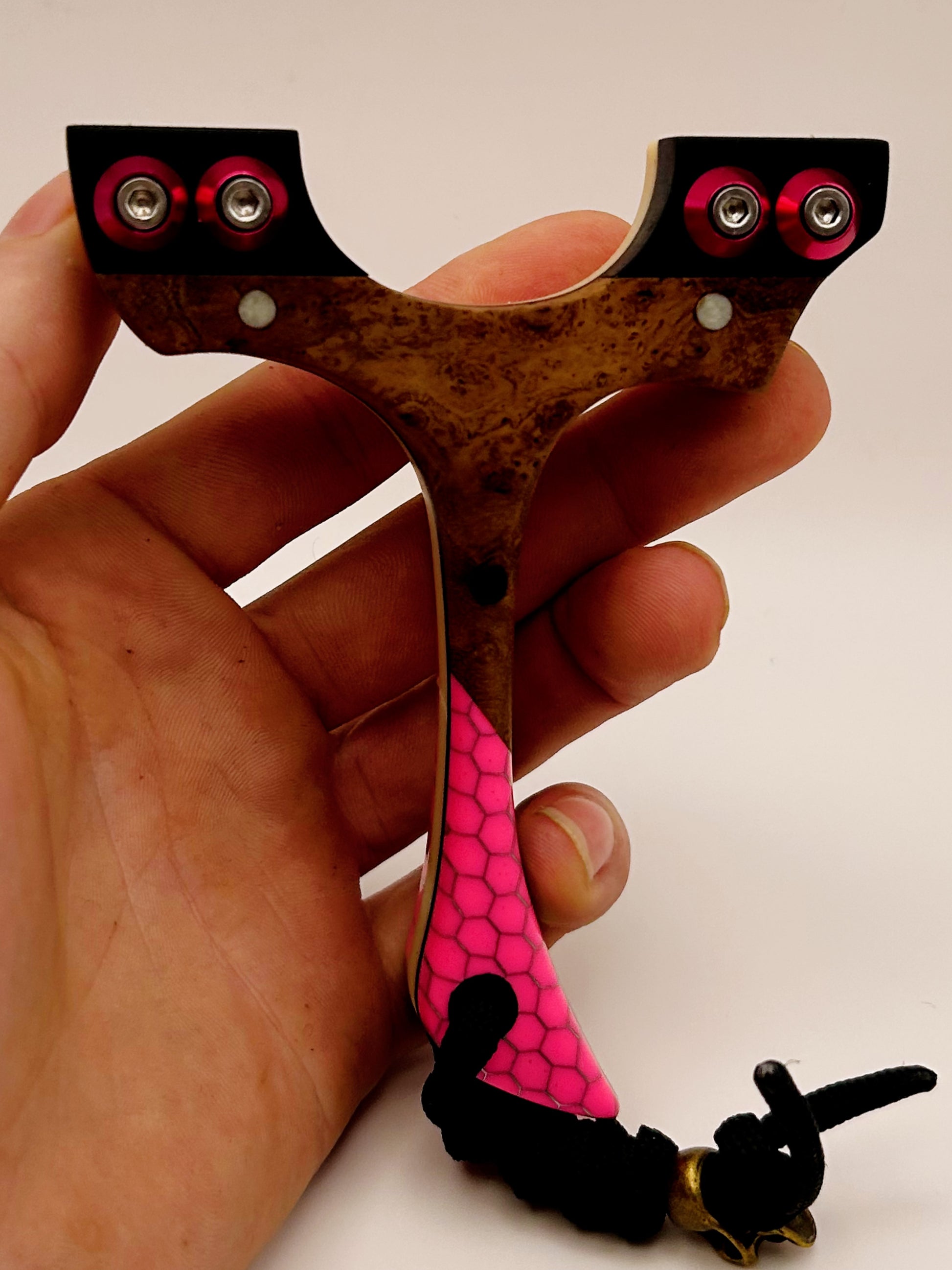 T-Bone (Left Hand Hold): Designed by Chuckin Steel and produced by Turtle Slingshots based in Indonesia. The T-Bone was designed to be held with a brace-grip style hold when using. Nice short forks with a comfortable ergonomic hold.