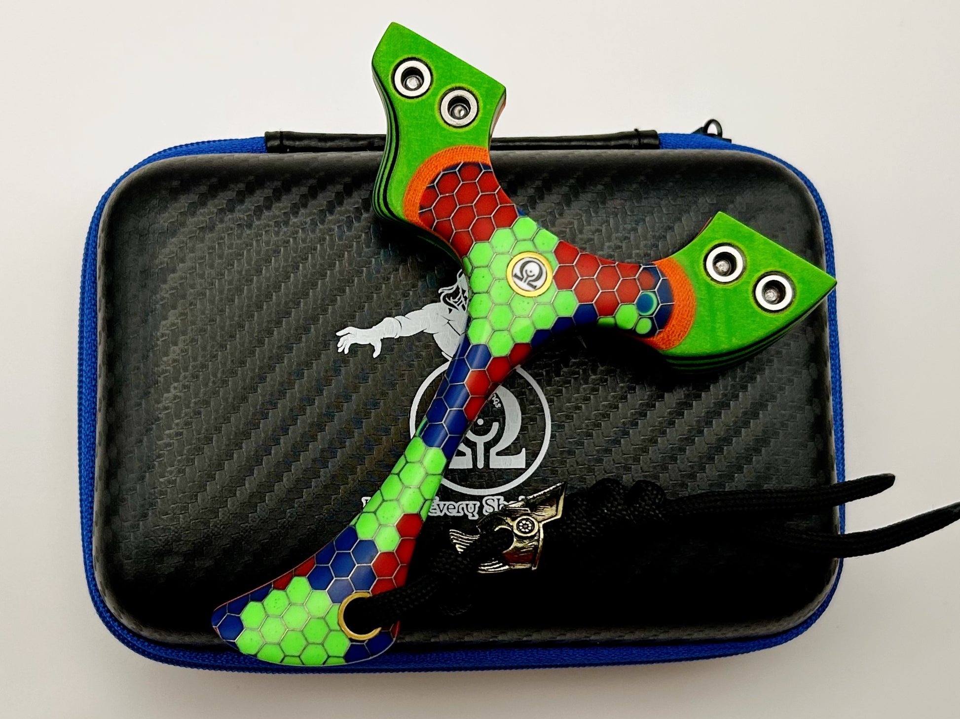 T-Bone (Left Hand Hold): Designed by Chuckin Steel and produced by Turtle Slingshots based in Indonesia. The T-Bone was designed to be held with a brace-grip style hold when using. Nice short forks with a comfortable ergonomic hold.