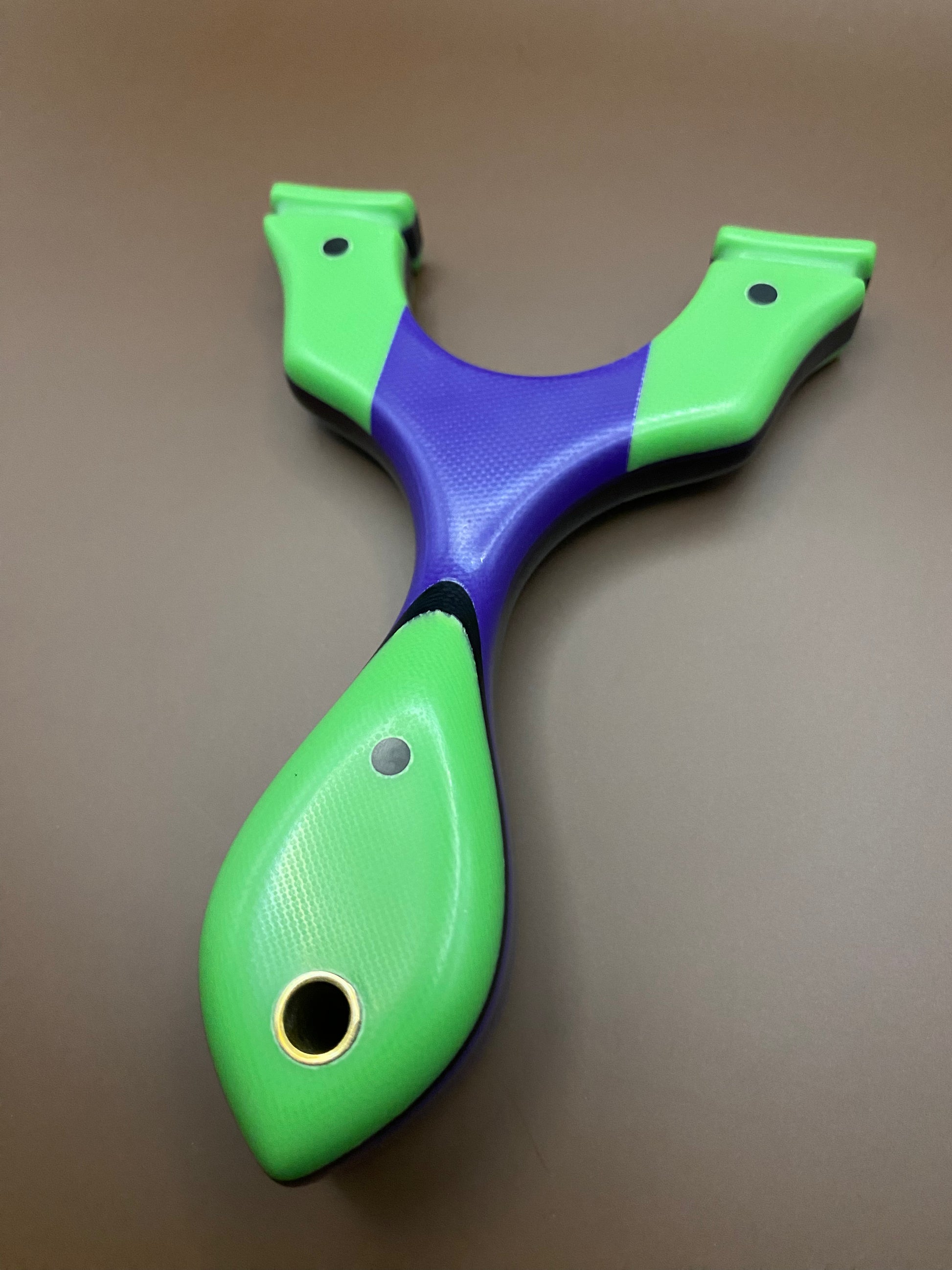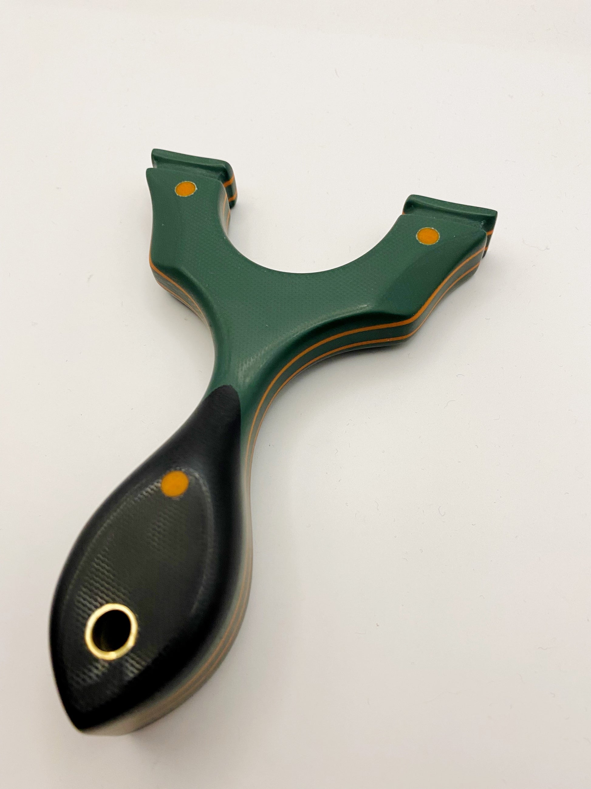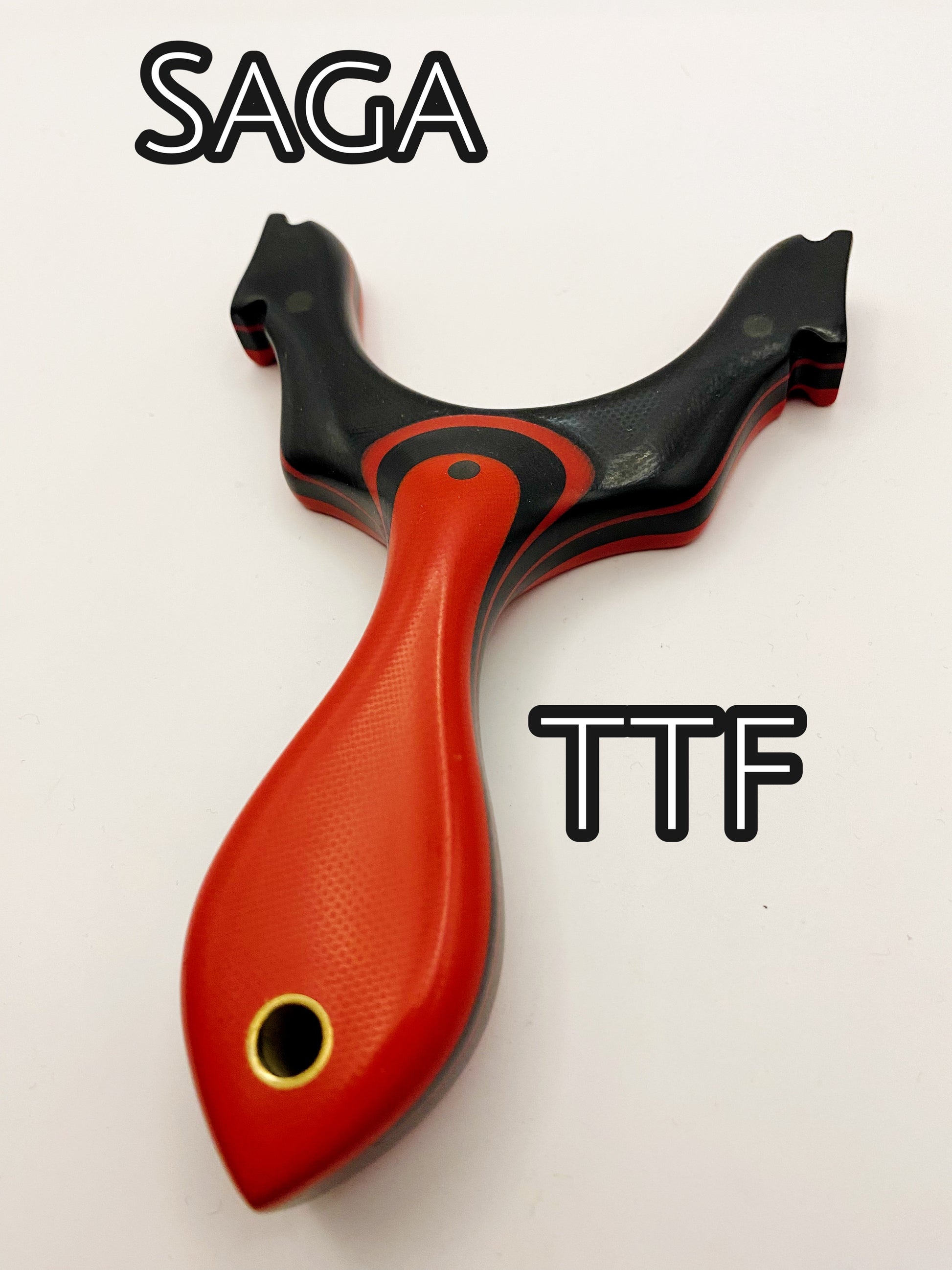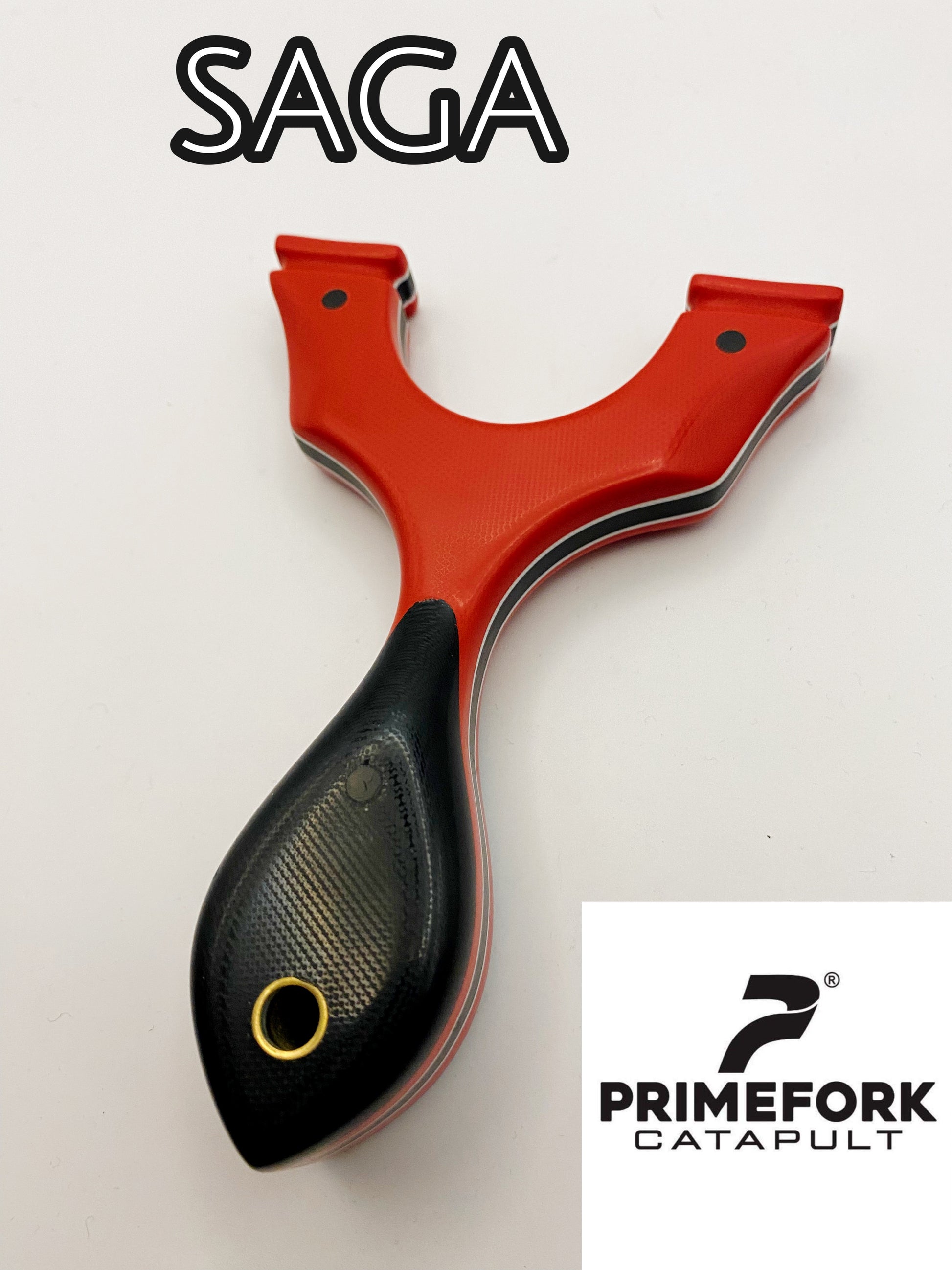 The SAGA- Designed and produced by PrimeFork Catapults in Indonesia. A wonderful center handle slingshot that is designed to be held in a thumb brace style when shooting.