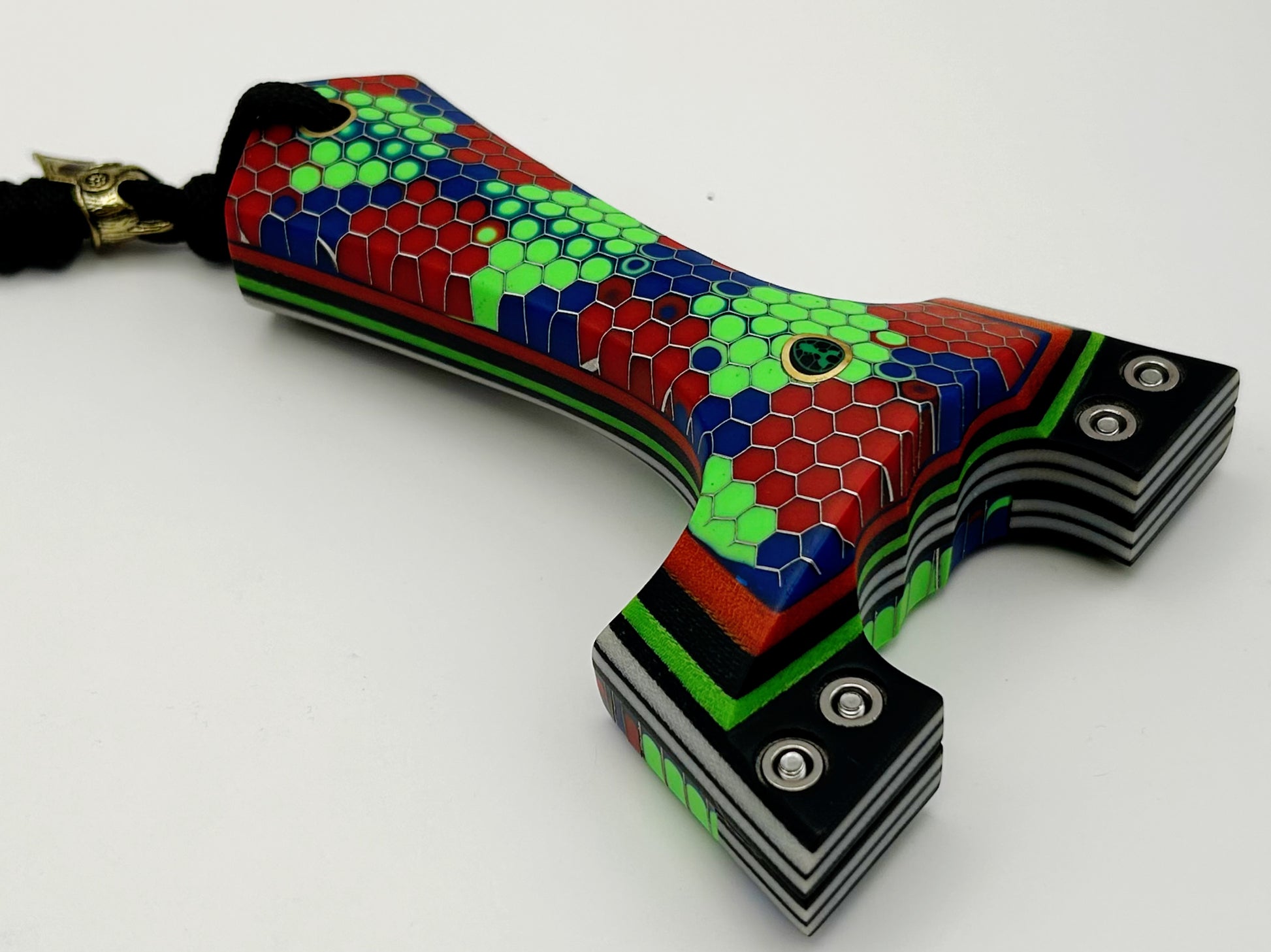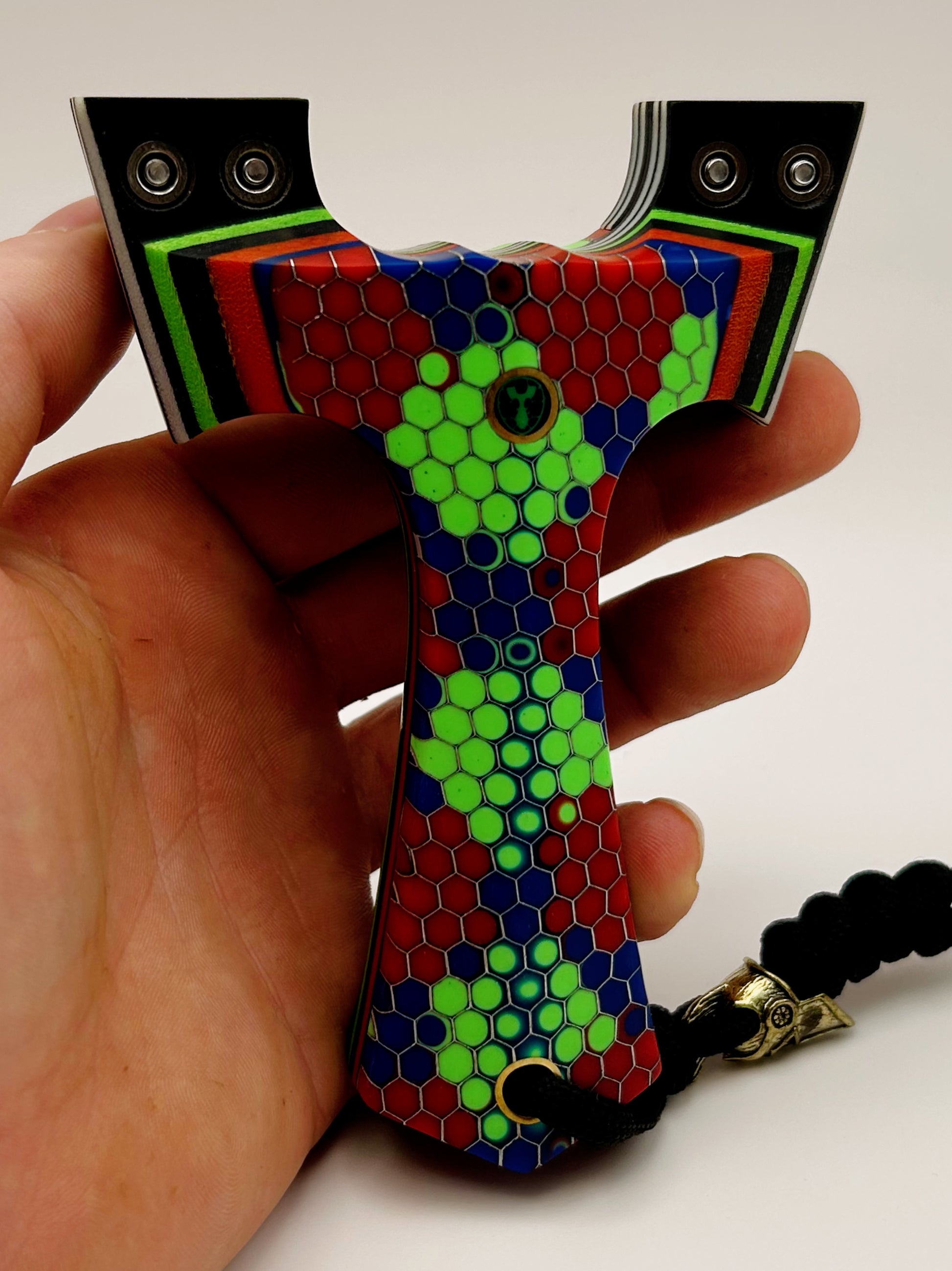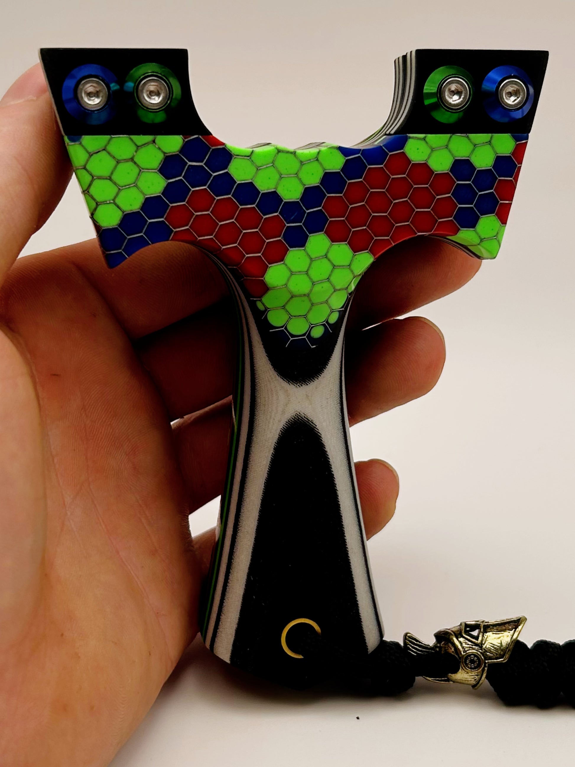 Tyson: Designed and produced by Turtle Slingshots based in Indonesia. The Tyson is a full size, full grip style frame designed to be held with a brace-grip style hold. Very comfortable ergonomic hold featuring a spartan lanyard bead. Very well balanced slingshot. Compatible with both left and right hand hold.